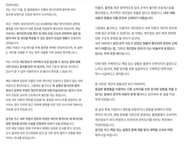 이번 사건에서 언급된 개인정보는 금융정보나 계정 비밀번호와 같은 직접적인 피해로 이어질 가능성이 높은 정보는 아니었지만, 팬 활동이라는 맥락 속에서 개인의 소비 성향과 신원이 함께 노출될 수 있는 정보라는 점에서 민감성이 낮다고 보기 어렵습니다. 팬사인회 응모 여부나 구매 수량은 개인의 팬 활동 이력과 직결되며, 특정 아티스트 팬이라는 정체성을 드러낼 수 있습니다. 이러한 정보가 내부에서 가볍게 언급되고 외부로 공유될 수 있었다는 점은 개인정보 관리 체계 전반에 대한 불신으로 이어지고 있습니다.