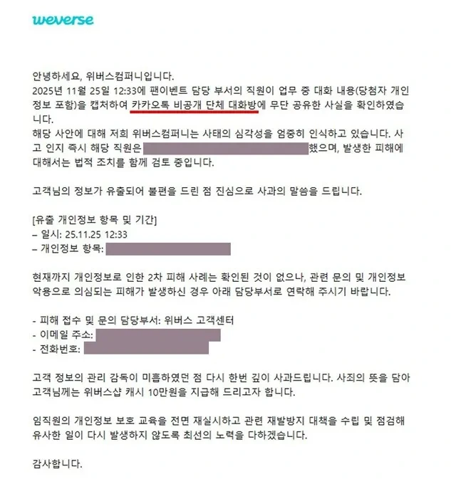위버스 운영사는 논란이 커진 이후 내부 조사를 통해 위버스 개인정보 유출 사실관계를 공개했습니다. 특정 시점에 팬 이벤트 담당 부서 직원이 업무 중 확인한 당첨자 개인정보가 포함된 대화 내용을 캡처해 외부 비공개 단체 대화방에 무단 공유한 사실이 확인됐다는 것입니다. 이 과정에서 회사의 공식 업무 채널이 아닌 사적 메신저가 사용됐고, 이는 명백한 내부 규정 위반으로 판단됐습니다. 회사 측은 해당 행위가 고의적 비위에 해당한다고 보고 즉각적인 인사 조치를 단행했다고 밝혔습니다.