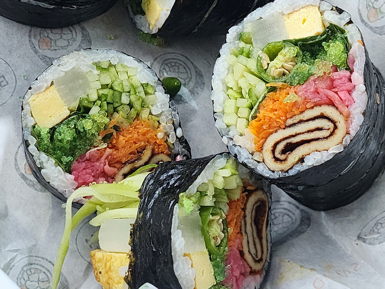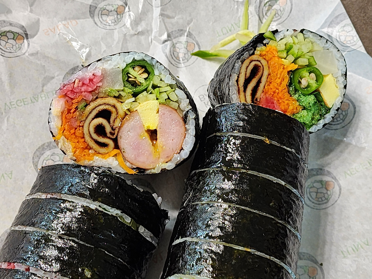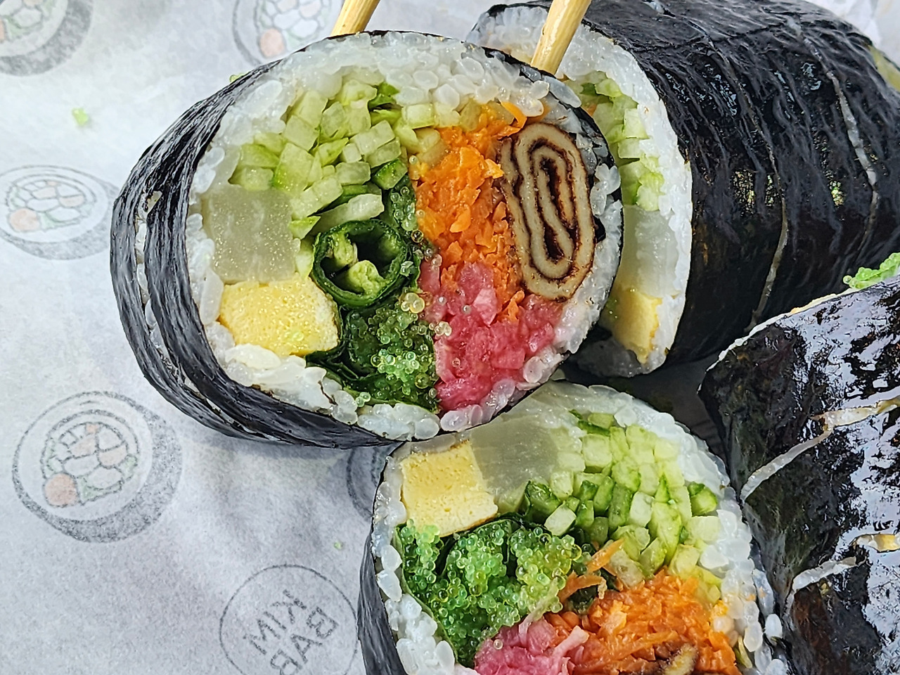 오색김밥이라는 상호는 단순히 여러 종류의 김밥을 판다는 의미를 넘어, 재료의 색감과 조합을 중시한다는 방향성을 담고 있습니다. 김밥은 단면이 곧 정체성이 되는 음식이기 때문에, 이곳에서는 재료의 색 배치와 식감 균형이 상당히 중요하게 다뤄집니다. 단무지, 당근, 계란 같은 기본 재료에만 의존하지 않고, 매콤한 고추류와 톡톡 터지는 날치알을 적극적으로 사용하면서 시각과 미각을 동시에 만족시키는 구성을 만들어냅니다. 이 점이 일반 분식집 김밥과 가장 크게 다른 지점입니다.
